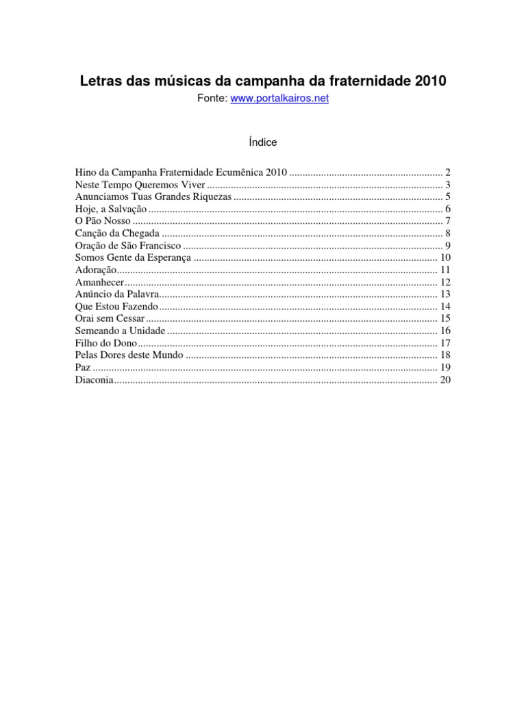 Letras Das Músicas Da Campanha Da Fraternidade Amor Oração https://pt.scribd.com/document/27747260/Letras-das-musicas-da-campanha-da-fraternidade